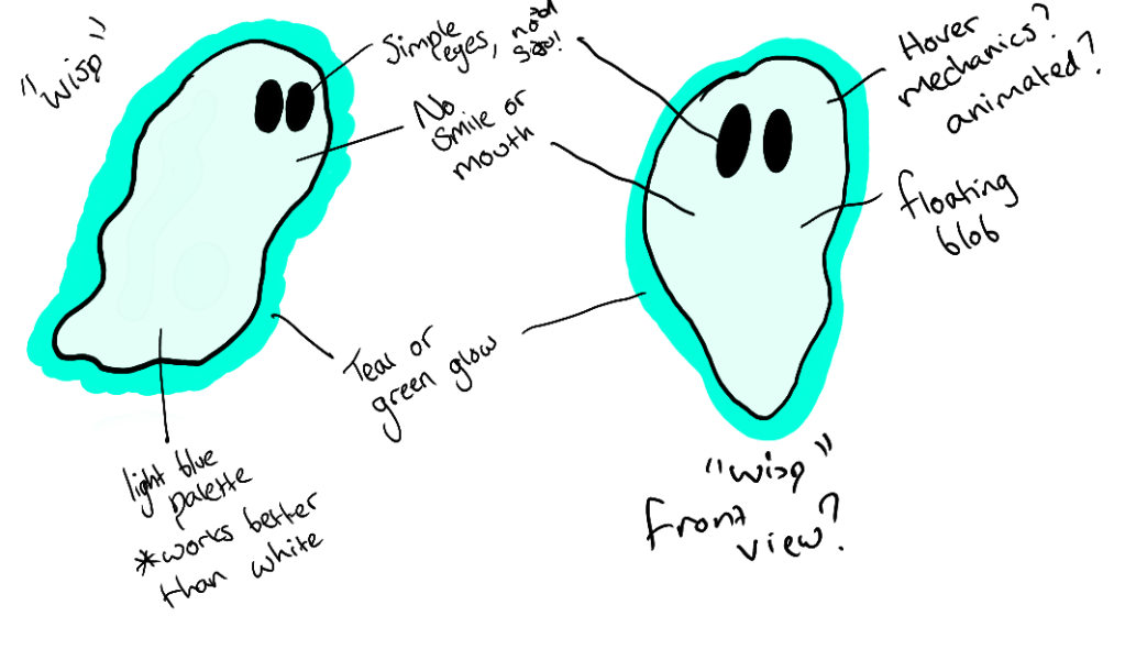 I designed and developed the character “Wisp,” including concept art and final character designs, a cute ghost who roams a hotel scaring guests (sometimes more adorable than terrifying).