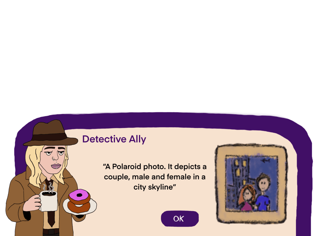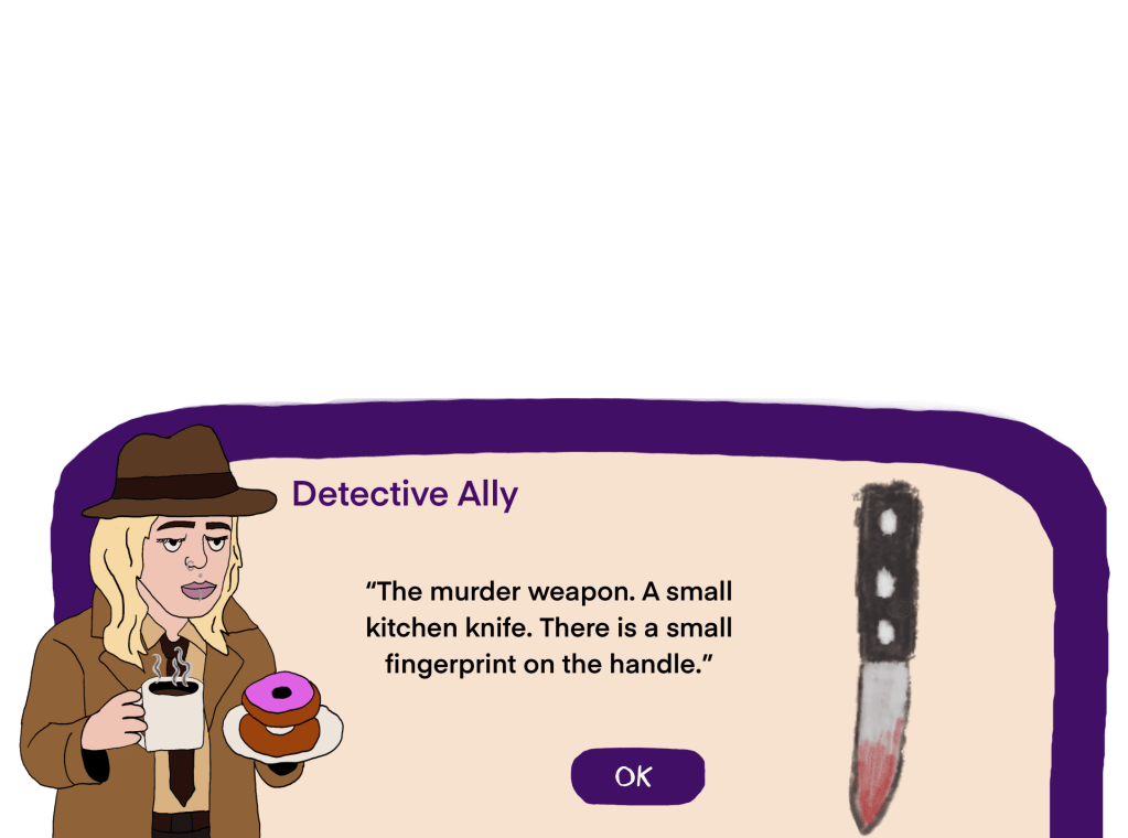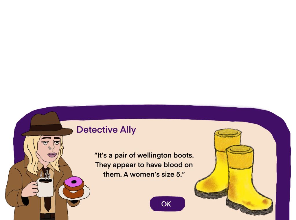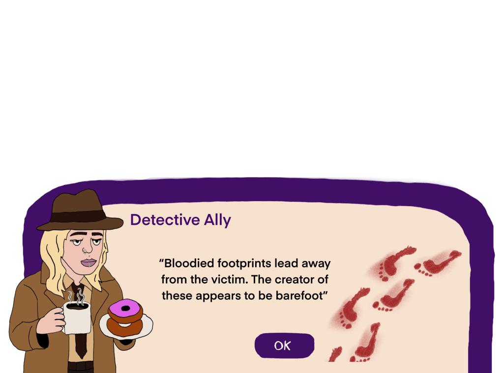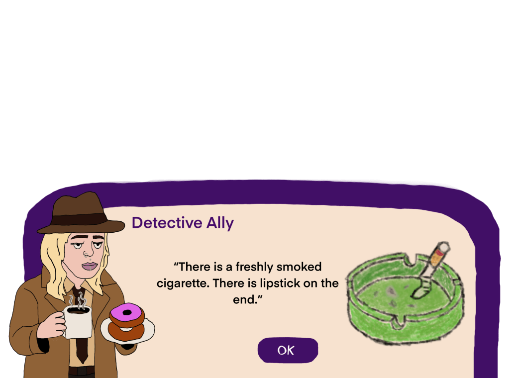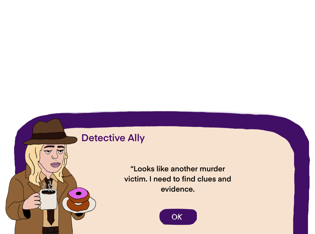For a university practice project, I created a one-page whimsical point & click detective story in GameMaker, featuring a moody detective version of myself, a mysterious murder scene, and interactive objects that glow green when hovered over.